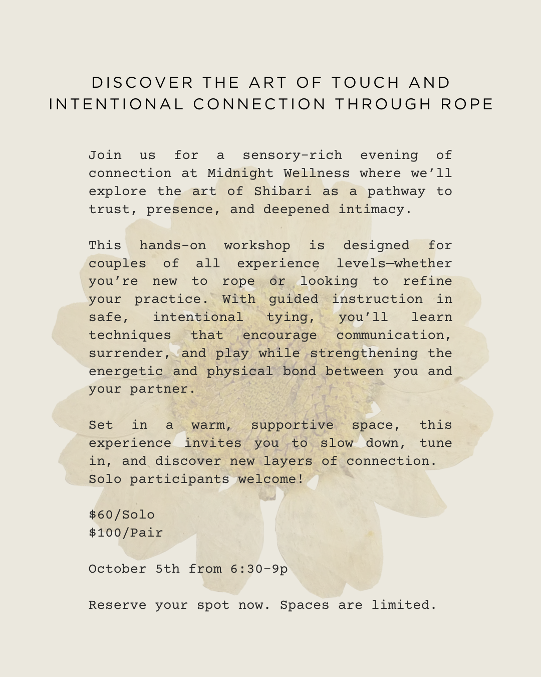 As a rope facilitator, Misha is dedicated to creating safe and Sacred spaces that support individuals on their journey of transformation, healing, and self-expression